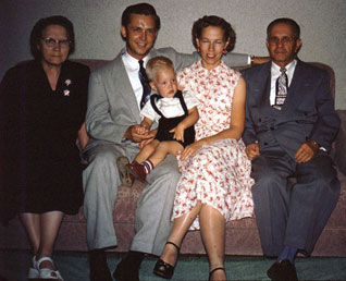 | On the living-room couch in Sunset, circa 1956: Pappy , Brent , Grandma , Jim , Scott , Ruth , Richard , Grandpa , Mammy |