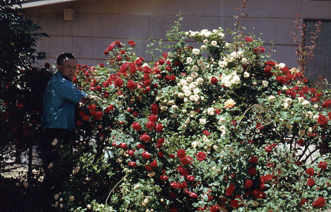 | Jim and his gorgeous roses, out back. Dunno whether he brought with him a preexisting love of roses, or whether he learned it from Grandpa. In either case, we’re authorized to rejoice. |