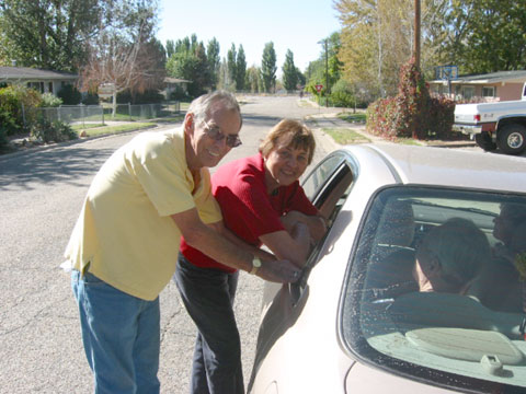 We stopped and chatted with a few of their old neighbors. That’s Valerie in the front seat. It was on this trip that Ruth and Jim kindly guided us to our former home at “ Sunken Heights,”, only a few blocks away, which we’d vacated when we moved to San Bernardino in 1946. |
