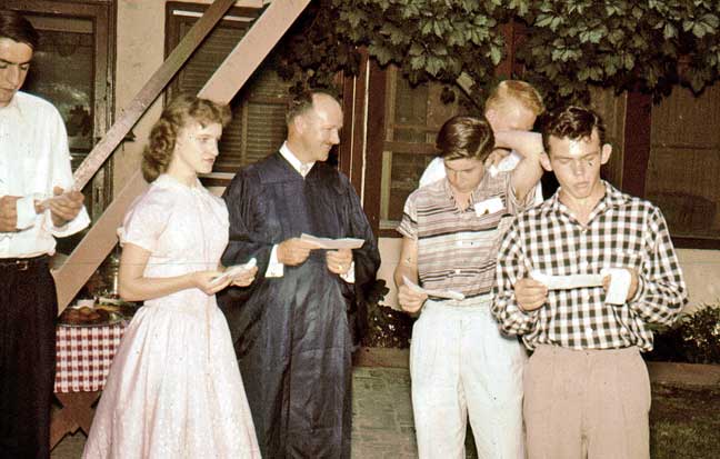 Seminary students, Woodrow A Miller, sporting a magistrate’s robes, seems to be enjoying himself. Whatever the task at hand, the other dramatis personae appear seriously befuddled. |