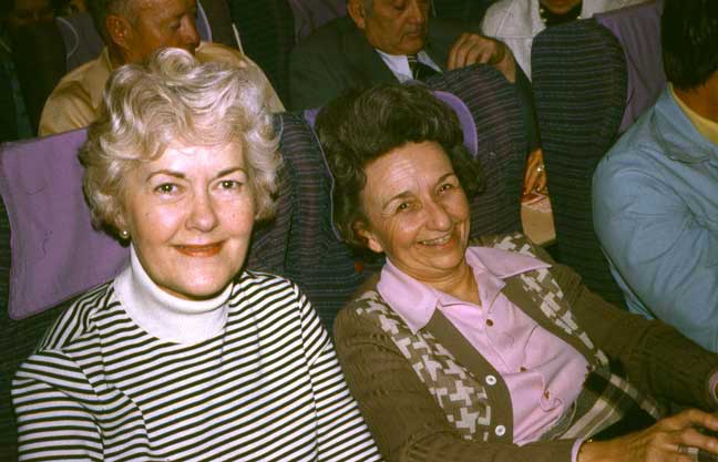 In 1977, Pappy and Norma put together a trip to Paris for themselves and some special friends-and-relations. I’m fuzzy on the details, but here’s Rita Miller on the plane. Below, they’re gathered at a café; Rita leans back to face the camera. |