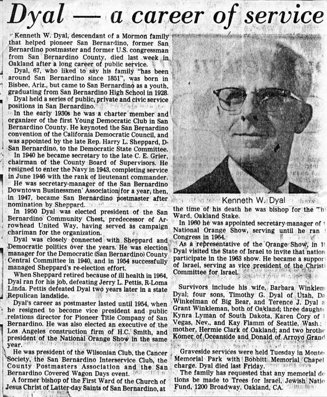 Their paterfamilias, the Honorable Kenneth Warren Dyal, a formidable and beloved presence in the civic and “Mormon” communities of my childhood and youth, served as Bishop of the Third Ward and therefore my bishop while I was on my first mission in France.1 In 1965-66, he represented San Bernardino County in Congress; I’ve reproduced on the next page his obituary and his entry in the Biographical Directory of the United States Congress. As detailed in the main body of this account, I sang with Kynra and Karen under Gladys’ direction and owe to that experience much of the pleasure that vocal music has given me ever since.2 |