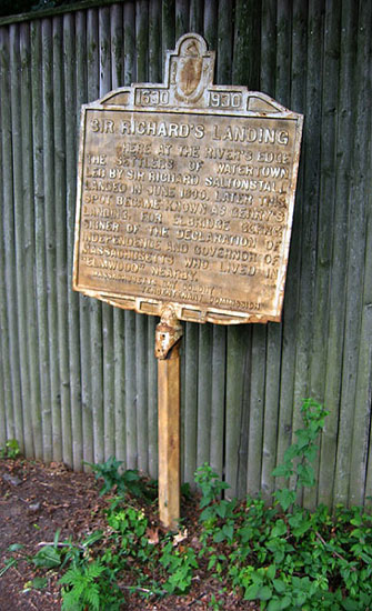 SIR RICHARD’S LANDING HERE AT THE RIVER’S EDGE THE SETTLERS OF Watertown LED BY SIR RICHARD SALTONSTALL LANDED IN JUNE, 1630. LATER THIS SPOT BECAME KNOWN AS GERRY’S LANDING, FOR ELBRIDGE GERRY, SIGNER OF THE DECLARATION OF INDEPENDENCE AND GOVERNOR OF MASSACHUSETTS WHO LIVED IN “ELMWOOD” NEARBY. MASSACHUSETTS BAY COLONY TERCENTENARY COMMISSION |