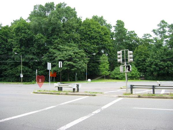 “Elmwood,” a mansion with a marvelous history and even some likely family connections for us, hides behind the trees. The heart locates a historic marker about the house. On the next page, the same shot, but in the opposite direction. |