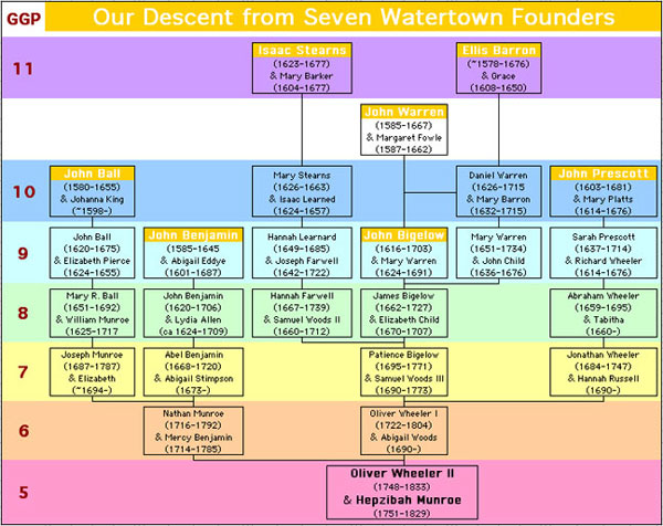 | As in the Harvard Square burial ground, our principal Watertown connections come through 5GGP Oliver and Hepzibah Munroe Wheeler, of Hillsborough, New Hampshire. Until recently (August 2002), we’d identified only six Founders on the Monument as direct ancestors. Then Cousin Irene Watson, a Richard Wheeler descendant, inquired whether the John Prescott listed there might be 9GGF Richard’s father-in-law and therefore our 10GGF. Irene’s right. Here’s our descent from all seven. |