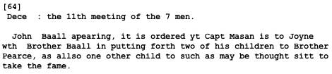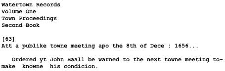 *We owe these transcriptions of the Town Proceedings to the Historical Society of Watertown, which undertook in 1891 to publish all the extant early records of the Town, with a grant of $1000 from the Town Meeting. A century later, the New England Historic Genealogical Society republished them as a compact disk (Boston:2002) with Bond, Henry, M.D., Genealogies of the Families and Descendants of the Early Settlers of Watertown, Massachusetts. I reproduce these extracts gratefully and literatim, without any attempt to correct their imperfections; may their successors show as great indulgence toward mine… I do comment, of course, where I may hope to clarify. As, for example, in the passage above about “such as may be thought sitt to take the fame.” Here the transcriber seems to have confounded the letters “s” and “f”. A common and forgivable error, when 19th- (or 21st-)century eyes squint at 17th-century handwriting.