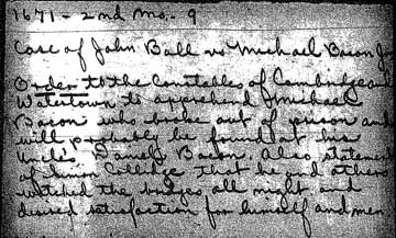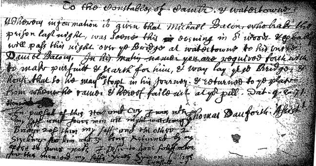 Whereas information is given that Michael Bacon, who brake the prison last night, was seene this evening in the woods probably will pass this night over the Bridge at watertowne to his uncle Daniel Bacon. In his Maties name you are required forthwith to make pursuit & search for him, & way lay the sd Bridge & house that so he may be stopt in his journey & returned to the place from whence he came. & hereof faile not at yr perill. Dat. 9-2-71 [illegible, blotted]