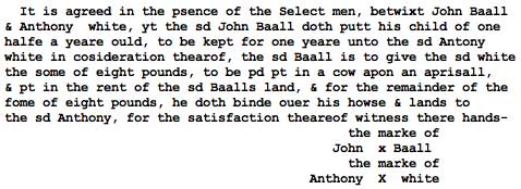 These deliberations set the baby up for a year’s care in the home of the family of Anthony White, at John Ball’s expense. Not at all clear how they planned for this one to bridge the gap to the magical age of five. ’Twould appear, alas, that little Abigail died in time to render the issue moot. |