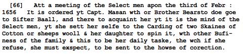 In February of 1656-7, just a couple of months after scattering Elizabeth Ball’s three children to other homes, Watertown Selectmen Mason and Bairstow draw the assignment to lay down the law to Mary’s mother.