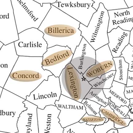 Please click on the map (or on the links below) to toggle a depiction of the three-mile circle around Munroe’s “Scotland,” and convince yourself that Bacon’s yard must have been in Woburn (which then included present-day Burlington, Wilmington, and Winchester). Just three miles separate, now as then, the site of “Scotland” from Woburn’s village center. *Bacon, Leon Brooks, op. cit., pp 366-67: “He is recognized by his father in a deed dated Oct. 4, 1666, as his ‘loving son, Michael Bacon, Jun., of Billerica, shoemaker.’” I plan to revisit that deed, to make sure that we’re talking about the same Michael and the right date. If 1666, we’re sure only that this Billerica Bacon can not have been “Michael Billerica.” |