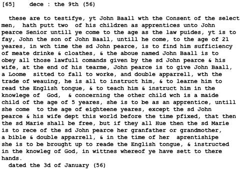 | Young John and his little sister Mary (the “maide child of the age of 5 yeares”) were not to enjoy the status of “children at home,” in their grandparents’ house, whatever that might have meant, in those days. As apprentices, they were to look to the Pierces for literacy (reading, at least) and religious instruction. |