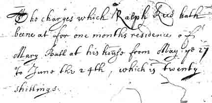 | This pregnancy put a number of documents in the durable public record, but we are still left with some unanswered (or unclearly answered) questions. Mary Ball clearly bore a child, most likely in the summer or fall of 1670. Ralph Reed’s bill says that Mary was at his house from May 27 to June 24th. |