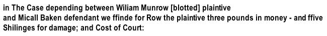 | On the 3rd of October, 1676, another Middlesex jury (MXCC III: 148) found in favor of William Munrow (a.k.a. “Row,” in the same sentence), plaintiff, against Michael Bacon. It seems that Goodwife Munroe (that’s our Mary, all grown up) sold a cow to Bacon, who subsequently “Refused” it, whatever that means. |