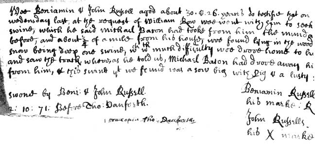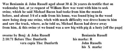 Like the Munroes, both Russells signed their affidavits by mark. Seventeenth-century Middlesex farming doesn’t seem to have required literacy. I wonder whether William had to learn to read and write before he could serve as a selectman. *About eight years later, Grandpa Benjamin would build a house in Concord (now Carlisle) that would remain a landmark into the 20th Century. The grave of his son, our eighth great-grandfather William Russell, occupies Plot #1 in Concord’s historic Hill Cemetery. |