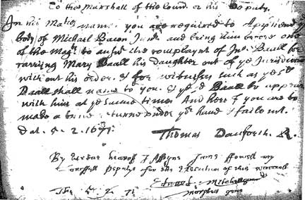 In his Ma[je]sties name, you are required to Apprehend the body of Michael Bacon Junr and bring him before one of the Mag[istra]ts to answr the complaynt of Jno. Ball for carrying Mary Baall his Daughter out of the Jurisdiction without his order. as for witnesses such as the sd Baall shall name to you. & the sd Baal to appear with him at the same time And hereof you are to make a true returne under your hand & faile not. Dat. 5-2-1671 Thomas Danforth R. |